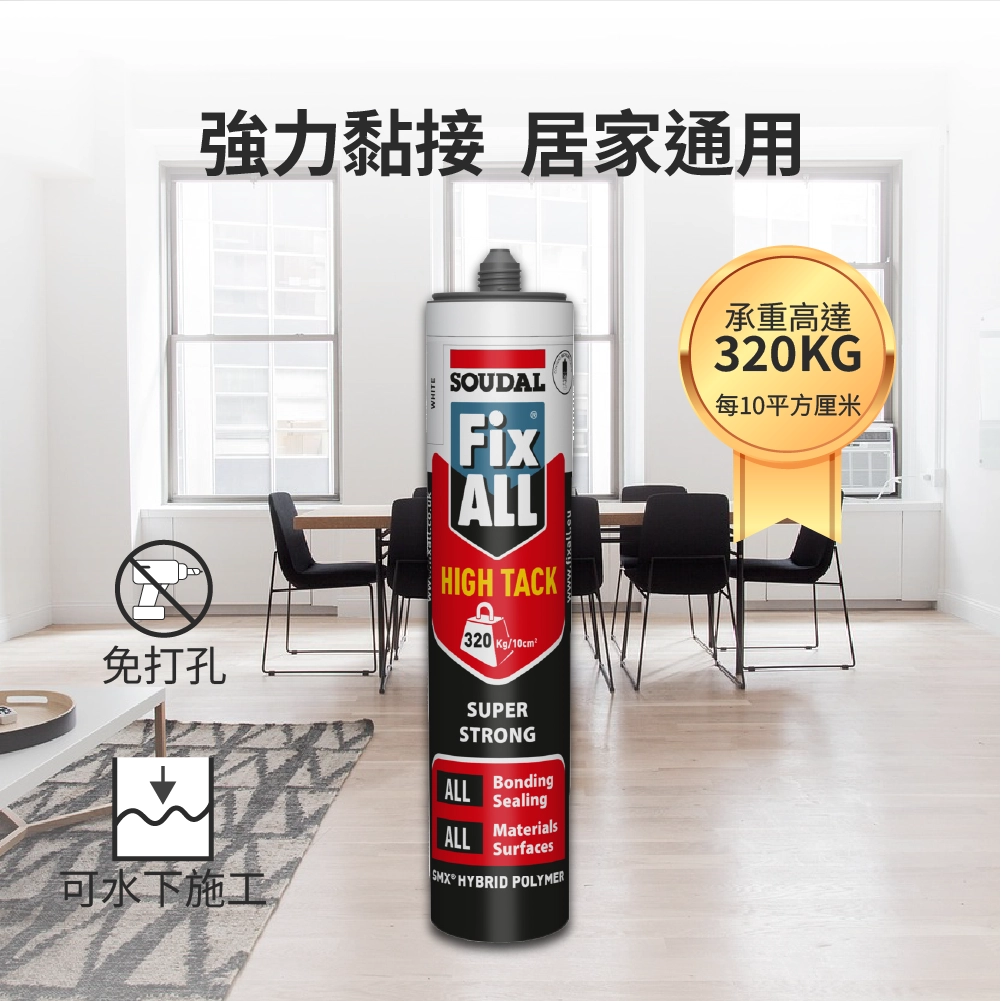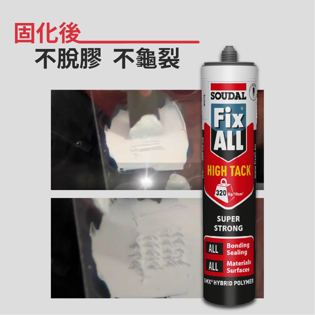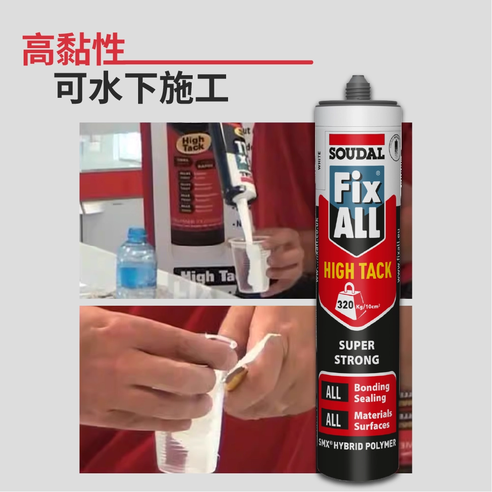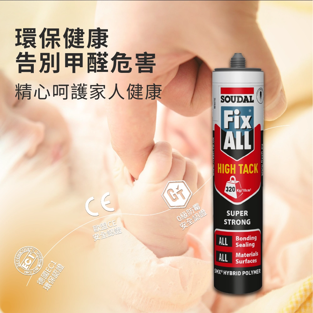 各項國際環保認證 高強度密封黏著劑 極高的最終強度達320kg/10cm² 適用於有孔或無孔表面,即使潮濕環境也可使用 耐候和防水 可上漆 Soudal專利SMX Polymer技術 更多信息請查閱標籤和產品規格書
