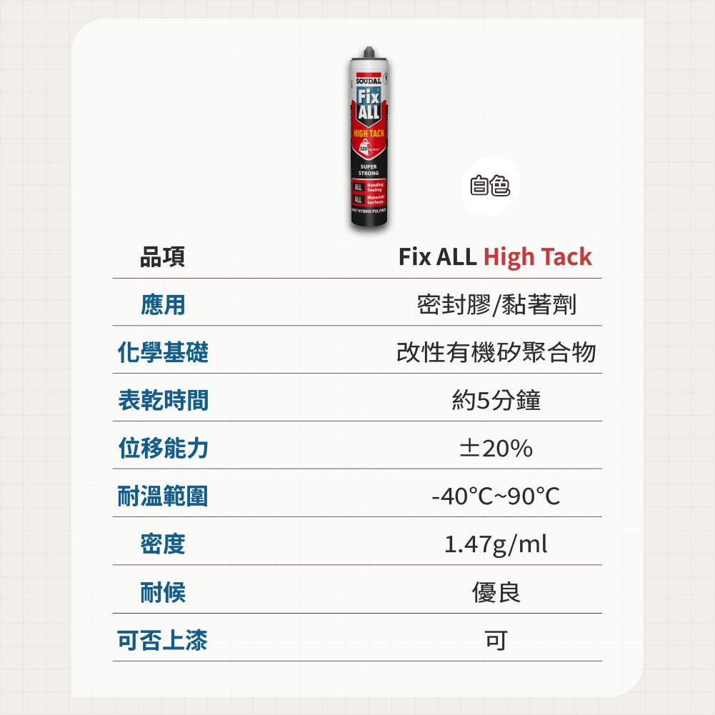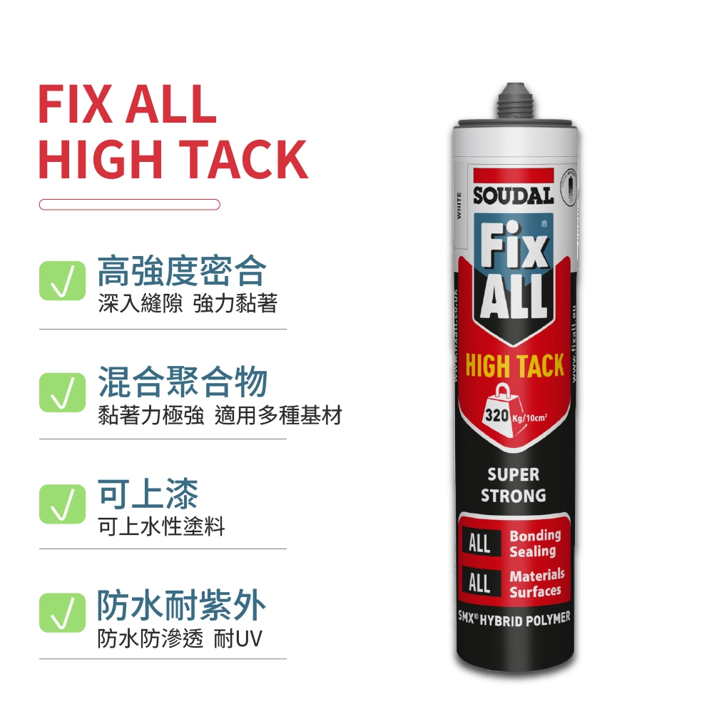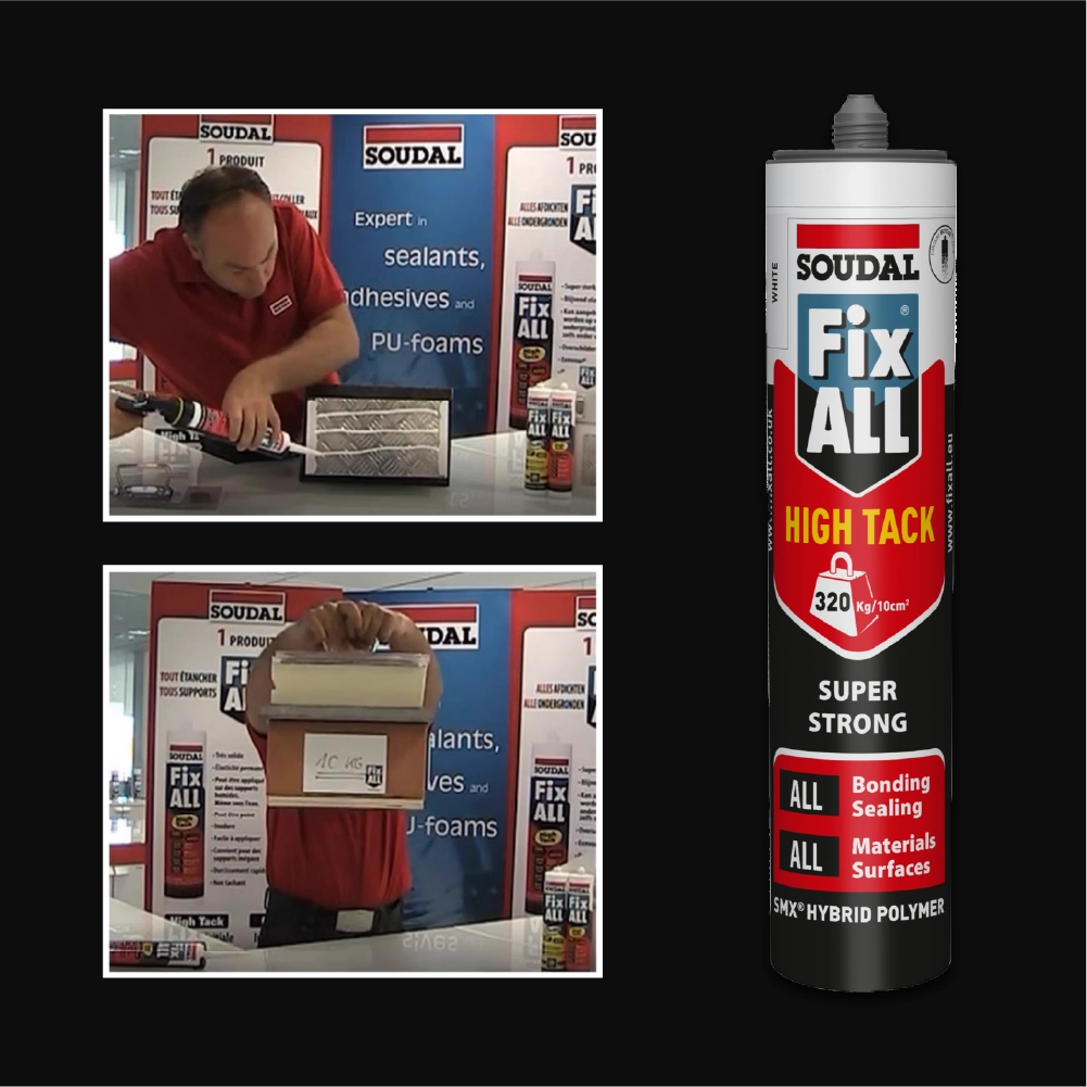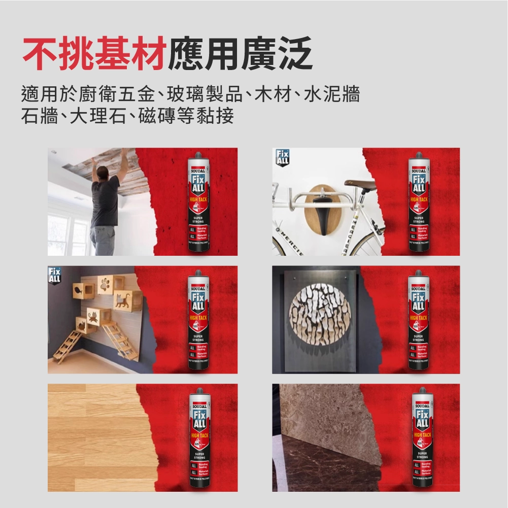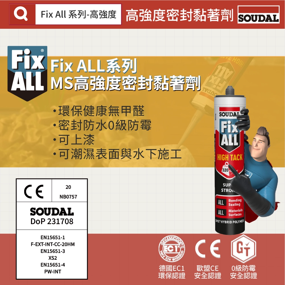 各項國際環保認證 高強度密封黏著劑 極高的最終強度達320kg/10cm² 適用於有孔或無孔表面,即使潮濕環境也可使用 耐候和防水 可上漆 Soudal專利SMX Polymer技術 更多信息請查閱標籤和產品規格書